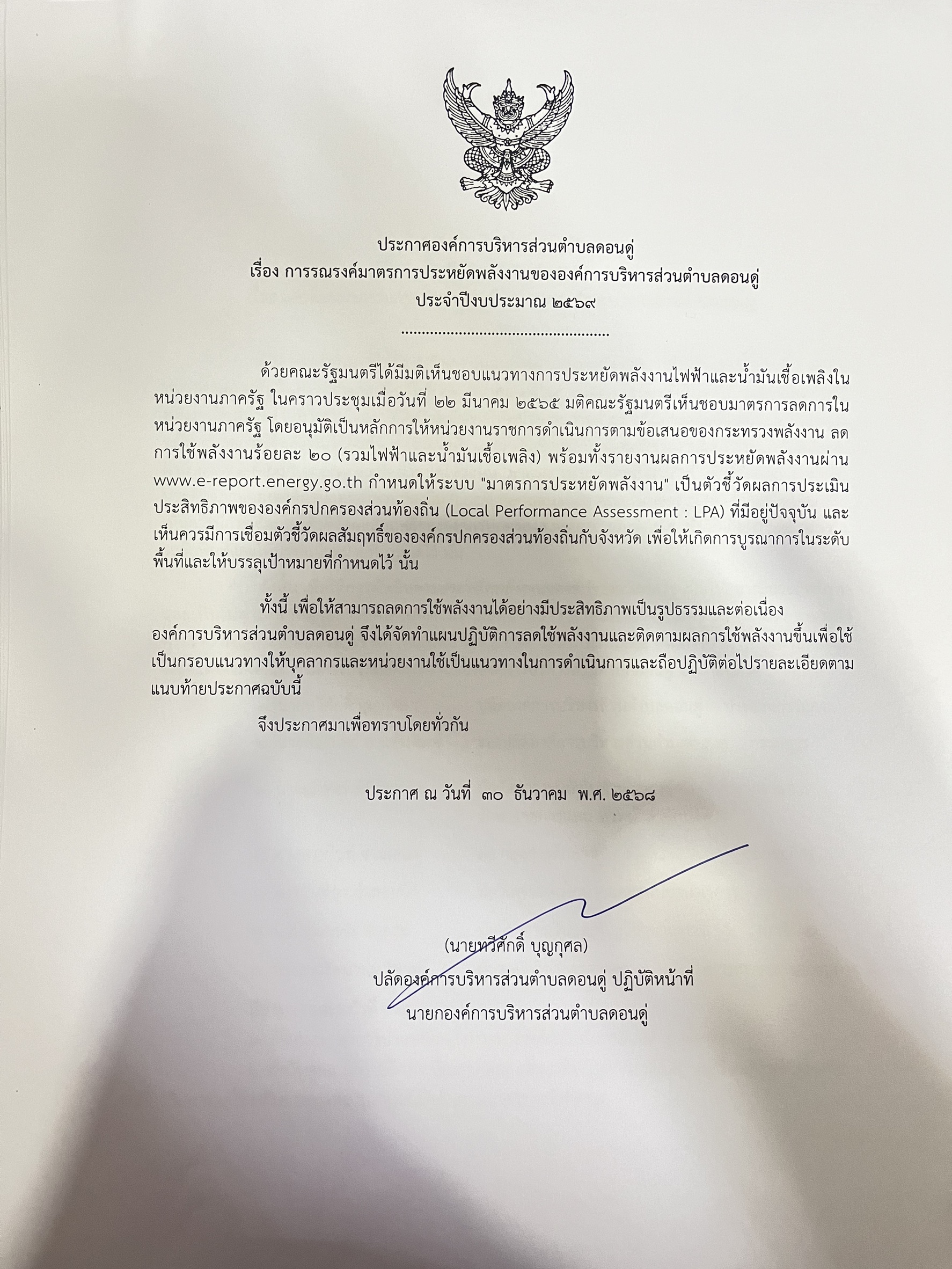 ประกาศองค์การบริหารส่วนตำบลดอนดู่ เรื่อง การรณรงค์มาตรการประหยัดพลังงานขององค์การบริหารส่วนตำบลดอนดู่