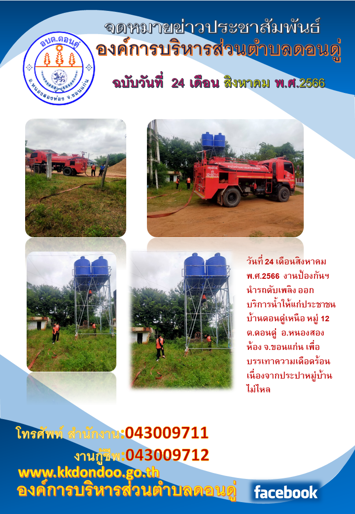 งานป้องกันฯ นำรถดับเพลิง ออกบริการน้ำให้แก่ประชาชน[วันที่ 2023-08-24][ผู้อ่าน 115]