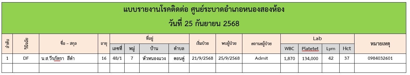 วันพฤหัสบดีที่ 25 กันยายน 2568 งานอนามัยและสิ่งแวดล้อมได้ทำการควบคุมโรคไข้เลือดออกโดยการพ่นยุง ณ บ้านหัวหนองแวง ม.7