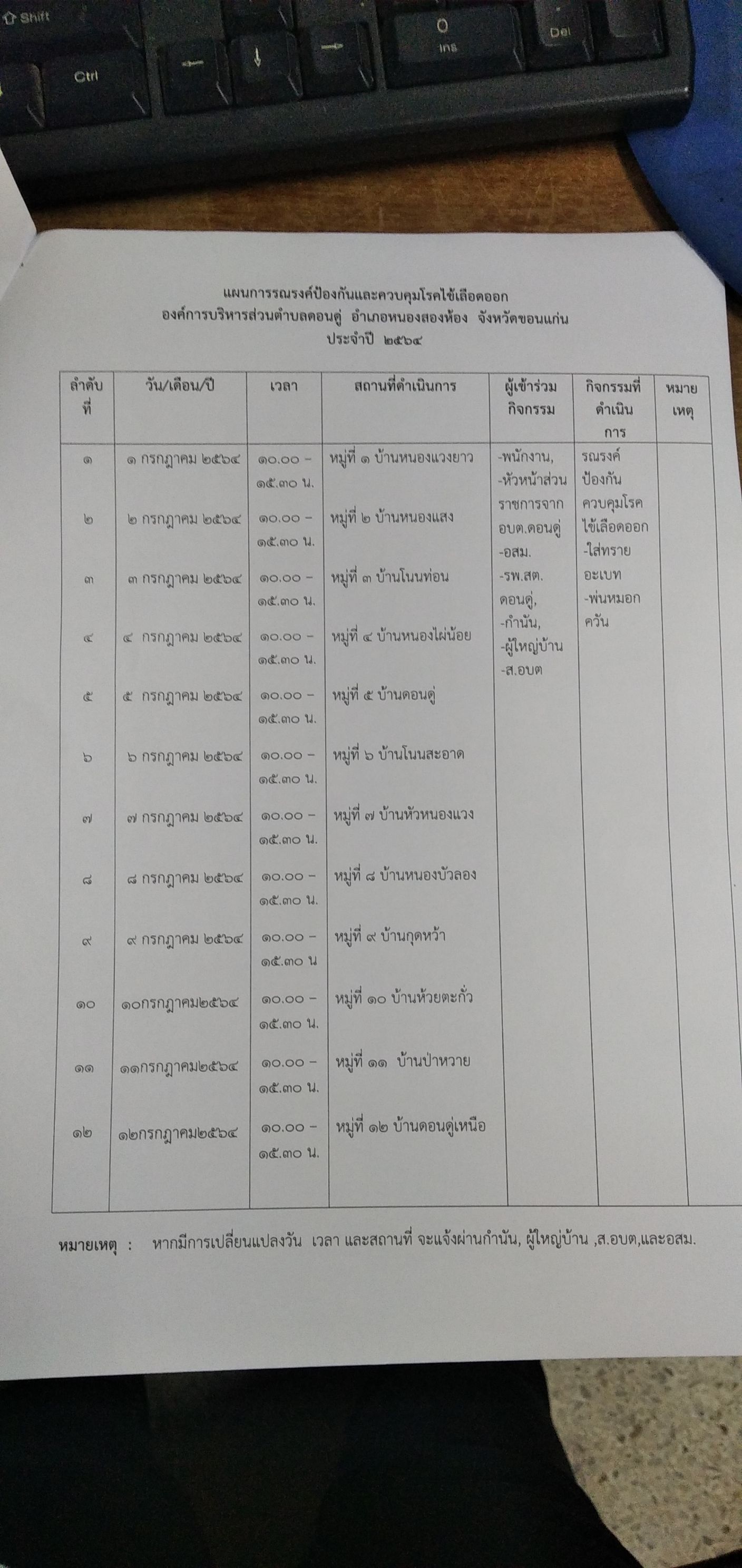 งานอนามัยและสิ่งแวดล้อม จัดทำโครงการป้องกันรณรงค์ป้องกันและควบคุมโรคไข้เลือดออกรหว่างวันที่1-12 กค.64 เวลา 10.00-15.30 น. วันที่1 บ้านหนองแวง วันที่2 บ้านหนองแสง วันที่3 บ้านโนนท่อน วันที่4 บ้านหนองไผ่น้อย วันที่5 บ้านดอนดู่ วันที่6 บ้านโนนสะอาด วันที่7 บ้านหัวหนองแวง วันที่8 บ้านหนองบัวลอง วันที่9 บ้านกุดหว้า วันที่10 บ้านห้วยตะกั่ว วันที่11 บ้านป่าหวาย วันที่12 บ้านดอนดู่เหนือ
