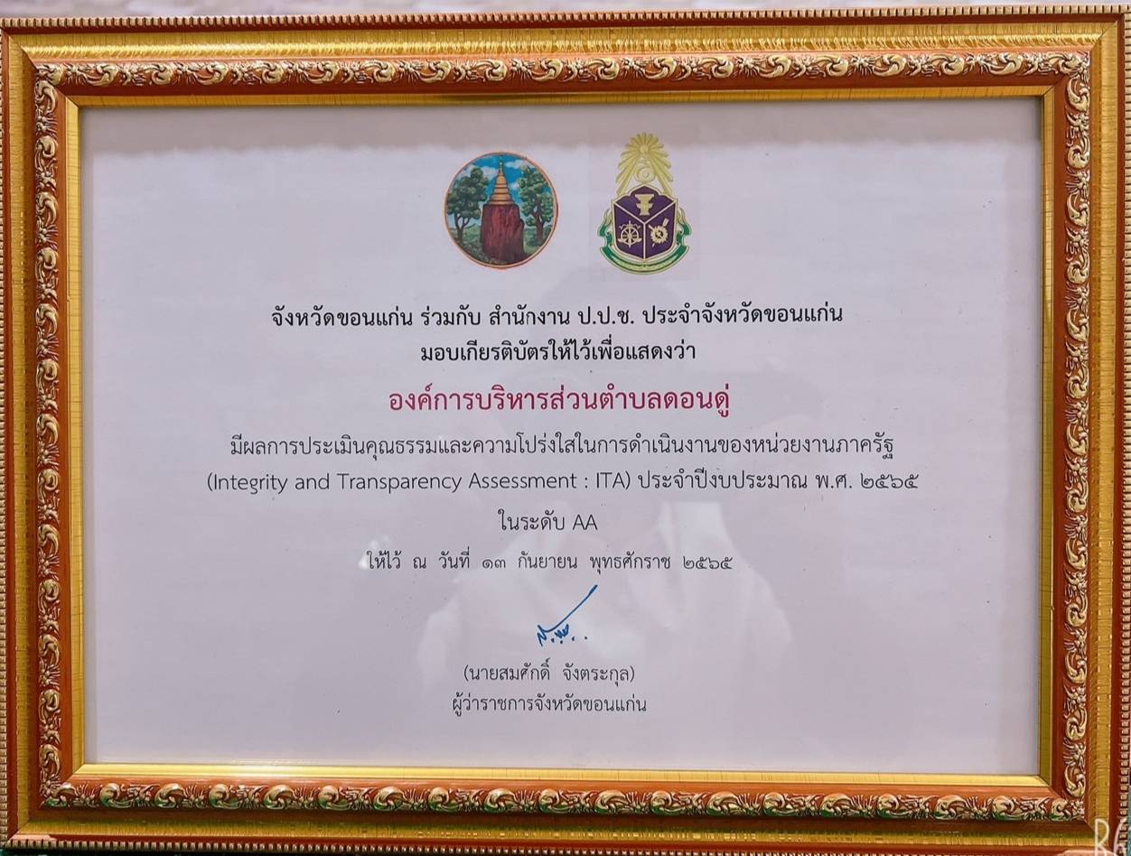 พิธีมอบเกียรติบัตรหน่วยงานที่ผ่านการประเมินคุณธรรและความโปร่งใสในการดำเนินงานของหน่วยงานภาครัฐ จังหวัดขอนแก่น ประจำปีงบประมาณ พ.ศ. ๒๕๖๕ และพิธีมอบรางวัลผลงานที่ชนะการประกวดคำขวัญ/คลิปสั้นต้านทุจริต จั