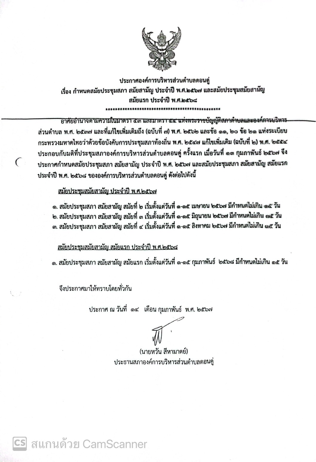 กำหนดสมัยประชุมสภา สมัยสามัญ ประจำปี พ.ศ.2567 และสมัยประชุมสมัยสามัญ สมัยแรก ประจำปี2568 |