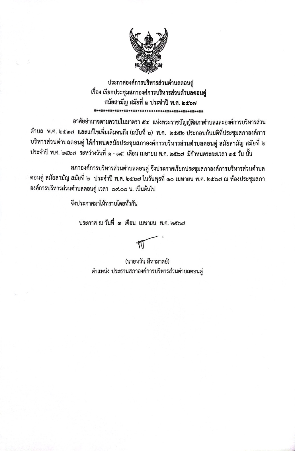 ประกาศ เรียกประชุมสภาองค์การบริหารส่วนตำบลดอนดู่ สมัยสามัญ สมัยที่2 ประจำปี 2567 |