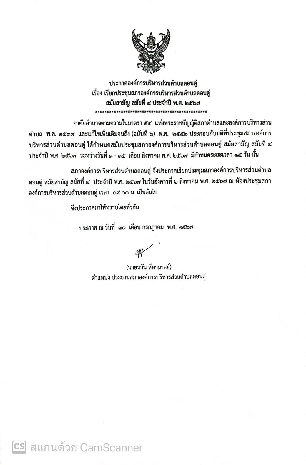 ประกาศ เรียกประชุมสภาองค์การบริหารส่วนตำบลดอนดู่ สมัยสามัญ สมัยที่ 4 ประจำปี 2567 |
