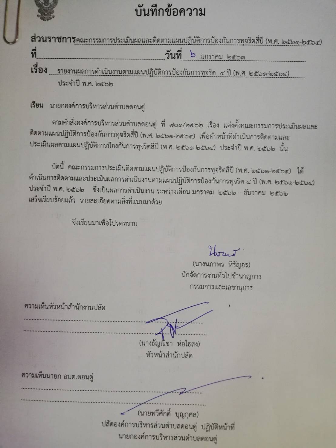 รายงานผลการดำเนินงานตามแผนป้องกันการทุจริต พ.ศ. 2562